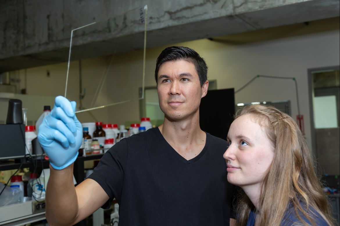 UCLA postdoctoral scholar Brian McVerry and doctoral student Mackenzie Anderson examine an ultra-thin membrane film on a glass plate used in the T-FLO process. (Image source: Marc Roseboro/UCLA)
