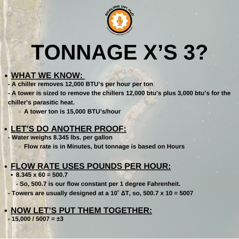 Over the last few Pinks and Blues episodes, I have been answering a few of your questions about equations we all use, but don’t know where they came from. Let’s do another one today! Today, we will be talking about the mysterious, tonnage times 3 to find the recirculation rate. If you are trying to find the evaporation of a cooling tower, you need to know the recirculation rate. And, because being a water treater is never easy, you can never find that information. At least not easily. Because of this common issue, we have all used the common “rule of thumb” tonnage times 3 equals the recirculation rate. But why and where does it come from? That’s what we are going to answer.