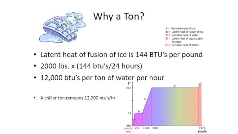 If you have ever wondered why we measure cooling in tonnage, it because it is based on a ton of ice. So, our equation is all about melting a ton of ice. The image below shows how we get a chiller ton:
