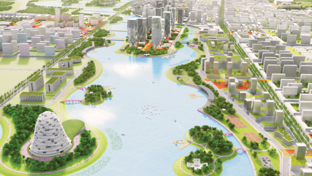 Bus stops and transfer nodes are planned within a 10-minute pedestrian walk to all new developments. In the lake, a group of new islands is planned. The “Central Business District Island” contains the most prominent new commercial buildings, and a chain of “Cultural Islands” contains new civic venues and gardens. The islands filter lake water and naturally enhance biodiversity and the living environment.