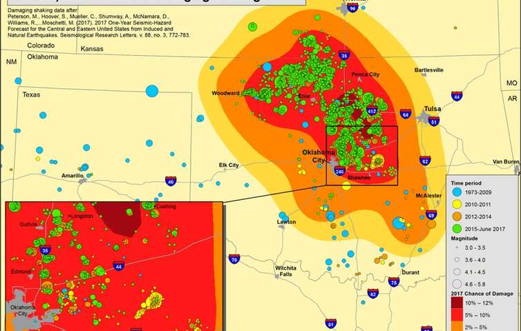 Property damage risk from hundreds of earthquakes above magnitude 3 in a large area of Oklahoma. Credit: US Geological Survey/Wikimedia Commons