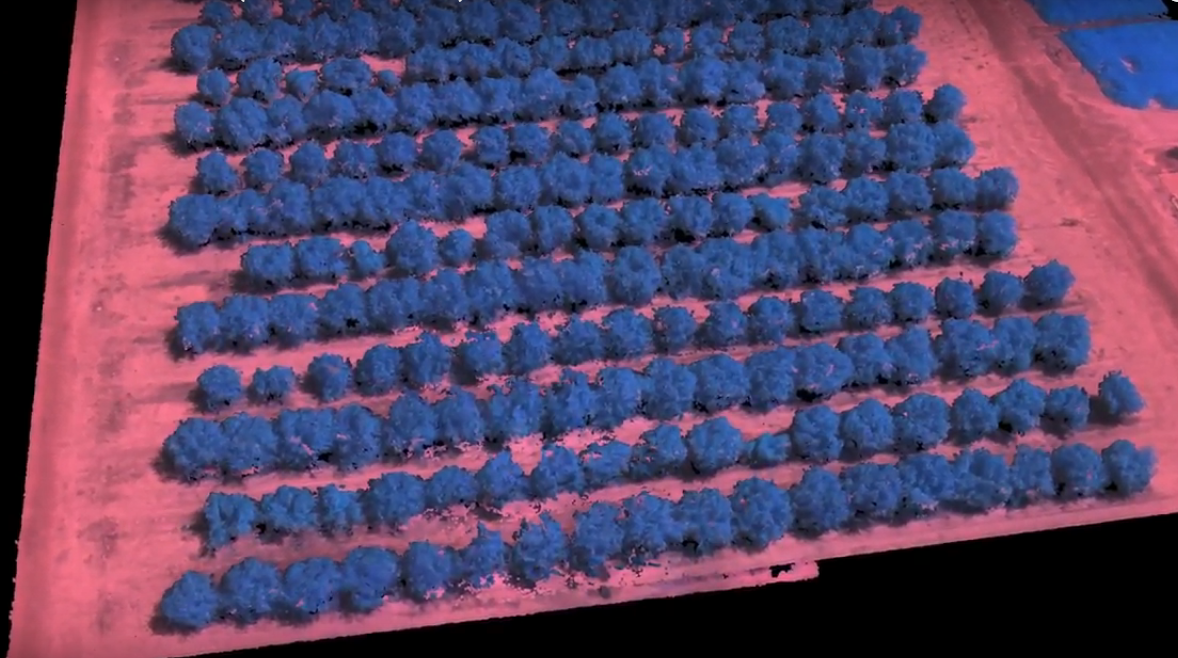As the drone flies over the trees, it snaps thousands of photos and, using photogrammetry and software that stitches the images together, makes a three-dimensional point cloud model of the orchard.