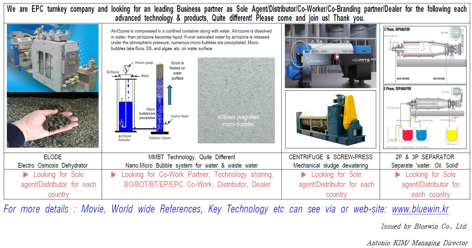 We, BLUEWIN CO., LTD. are small and medium size EPC family maker with 200 peoples working, U$65mil turnover/2019 and having 35 years Valued references with World unique advanced technology/system for water, wastewater, sludge treatment and Oil separation business field as below. We hope you to visit and see the actual movie for more details for each technology;