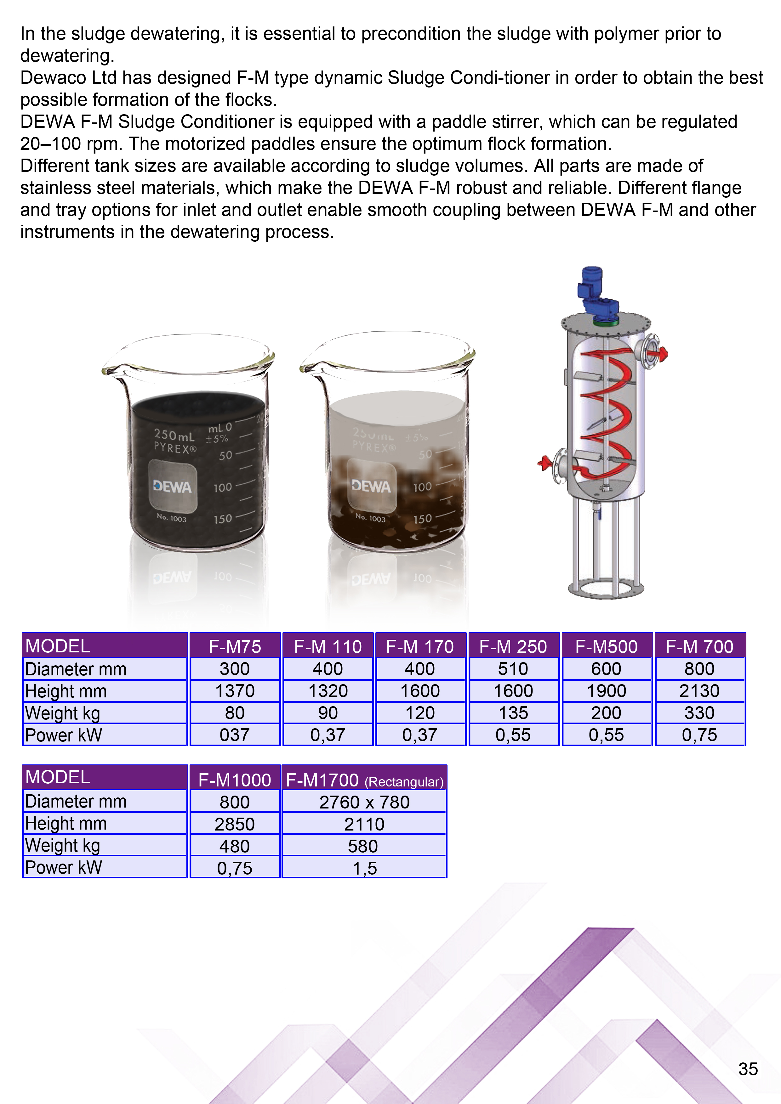 DEWA Flocculator is equipped with a paddle stirrer, which can be regulated 20–100 rpm. The motorized paddles ensure the optimum flock formation. Different tank sizes are available according to sludge volumes.