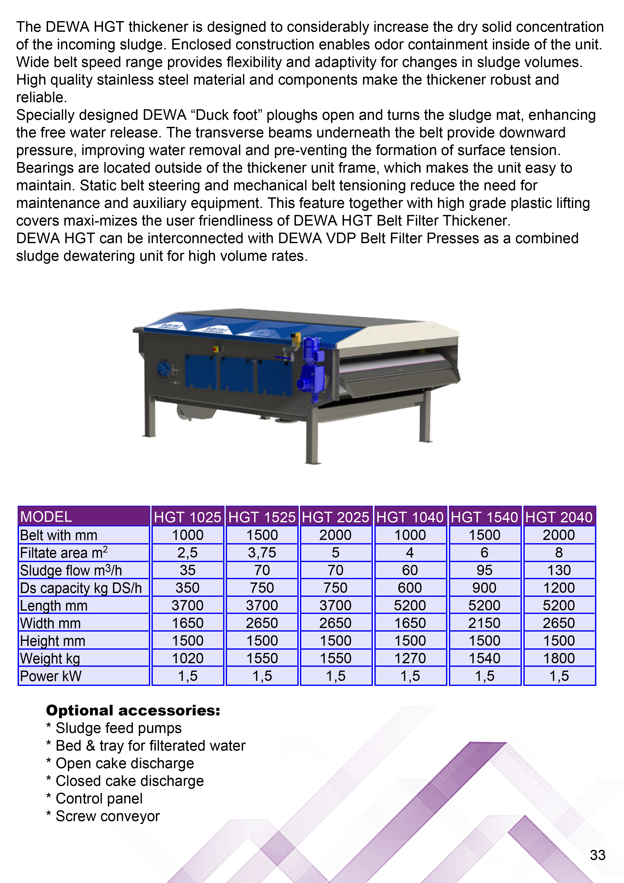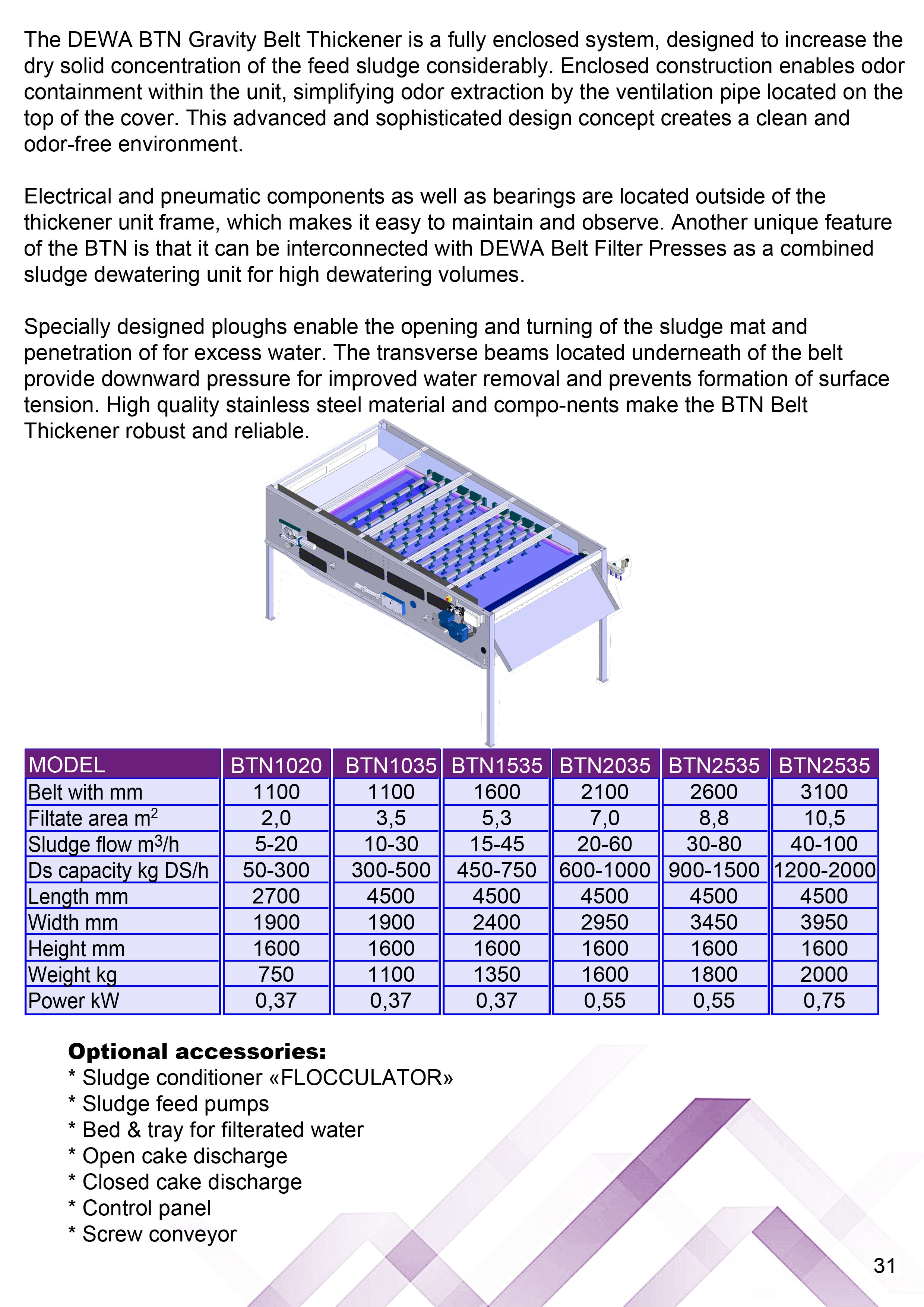 Specially designed ploughs enable the opening and turning of the sludge mat and penetration of for excess water. The transverse beams located underneath of the belt provide downward pressure for improved water removal and prevents formation of surface tension. High quality stainless steel material and compo-nents make the BTN Belt Thickener robust and reliable.