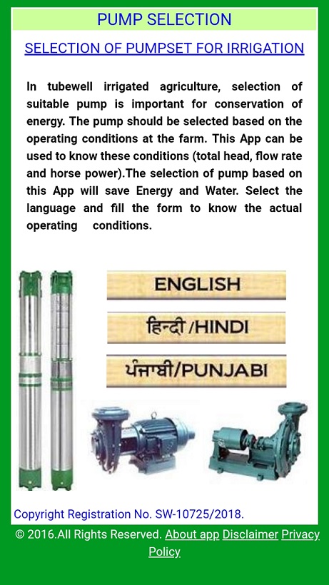 Irrigated agriculture being highly dependent on groundwater resource, has caused fast declining of water level in many parts of the country due to excess withdrawal of groundwater than the recharge. Many of the farmers have to shift from horizontal centrifugal pumps to submersible pumps of higher motor rating to extract water from deeper depths. With increased depth of water table, the energy consumption in pumping water for irrigation has increased manifold during the last 2 to 3 decades. Therefore, it is important to install suitable efficient pump set for irrigation based upon the actual operating conditions at the farm. A mobile application named "Pump Selection" has been developed based on the scientific considerations, that can be used by the farmers, to know the actual operating conditions at the farm and accordingly, suitable energy- efficient pump set can be selected. The pump set selected based upon this app operates near to desired efficiency level for a longer period, thus avoiding wastage of electrical energy and water.