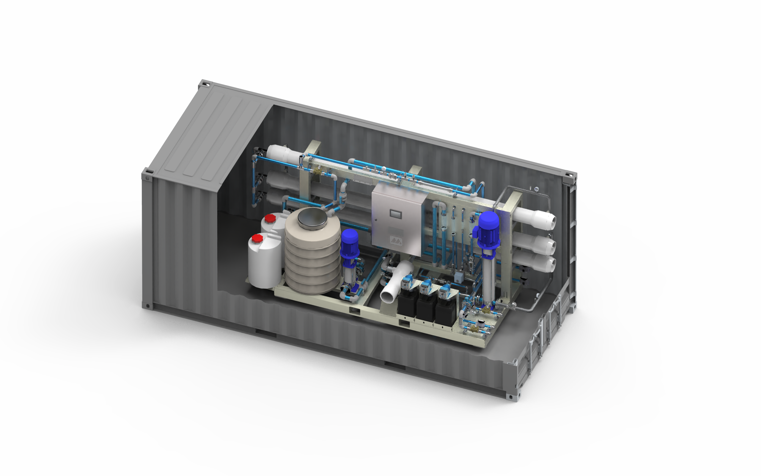 B-0410: Main characteristics • 4000 L/h to 10,000 L/h range • Treats source water up to 7,000 PPM TDS • High quality components • Detail engineered designs • Focused on reliability & maintainability • Fits into shipping containers for transport or operation • Variable speed drives for high versatility • Complies with international drinking water standards