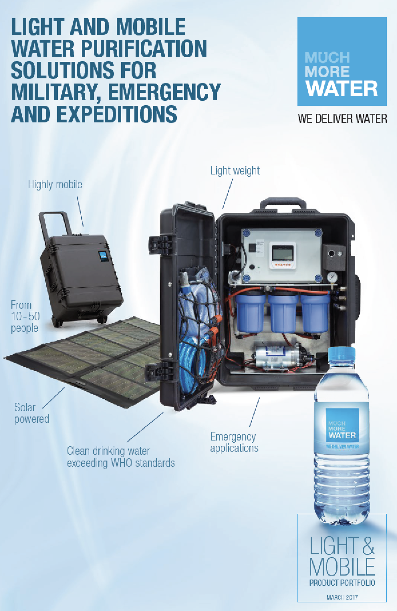 Light mobile Reverse Osmosis water purification for expeditionsThis unit has a daily capacity of 1440 litres per day, giving 5 litres of drinking water for 288 people, or 72 pcs 20 L bottles. 2x Ultra Filtration + 1x Activated Carbon + 2x Reverse Osmosis + Ultra Violet