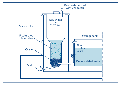 2. Adsorption and ion-exchange - In the adsorption method, raw water is passed through a bed containing defluoridating material. The material retains fluoride either by physical, chemical or ion exchange mechanisms. The adsorbent gets saturated after a period of operation and requires regeneration. The different adsorbents used for fluoride removal include activated alumina, carbon, bone charcoal and synthetic ion exchange resins.