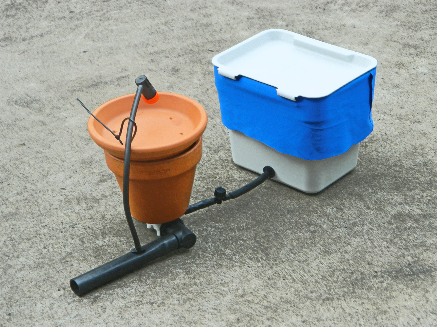 A polyester cloth is provided to wick water from inside the container to outside the container to evaporate. The interval between irrigation events can be adjusted by exposing more or less of the polyester cloth. The lid on the container protects the water in the container from debris, algae, mosquitoes and thirsty animals.