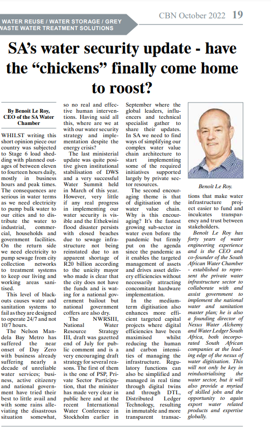 Update on South Africa's water security issues. Published on October 9, 2022 12:42 by Benoit Le Roy, Operations Director at Nexus Water AlchemyUpdate on South Africa's water security issues. Media
