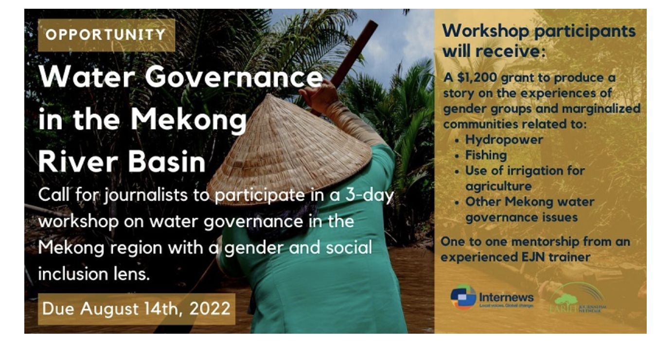 Call for journalistshttps://opportunitydesk.org/2022/08/09/ejn-media-workshop-and-story-grants-2022-to-report-on-mekong-water-governance/
