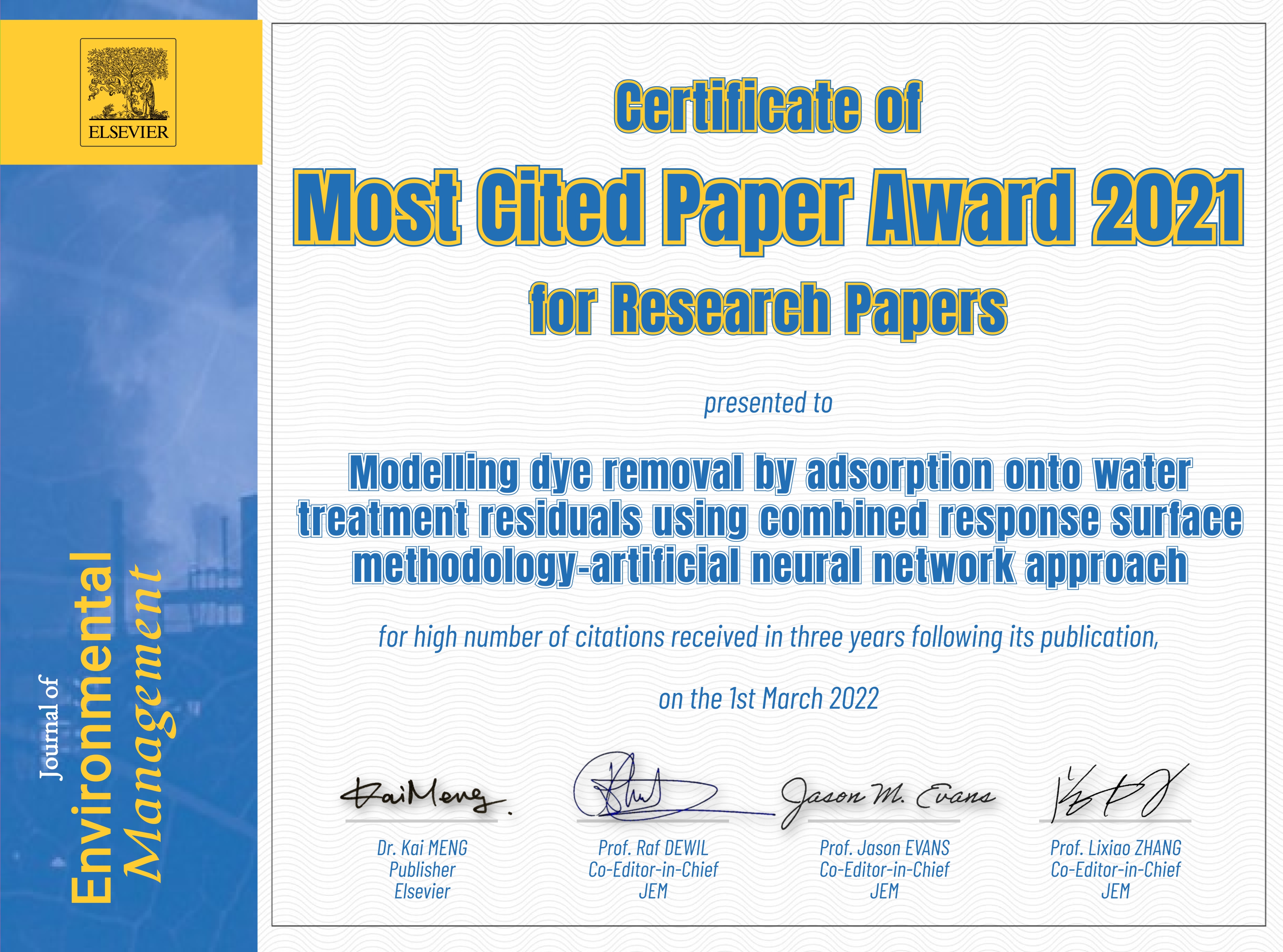 Recently an award for the most cited article received from the Journal of Environmental Management, Elsevier. The article entitled, "Modelling dye removal by adsorption onto water treatment residuals using combined response surface methodology-artificial neural network approach" is authored by me (Mahesh Gadekar) and my research guide and supervisor (M Mansoor Ahammed). The work demonstrate ability of sludge from water treatment plant to be used in the industrial wastewater treatment (textile wastewater treatment) for colour removal. Further, the process is modelled using combined approach of the response surface methodology (experiment design) and artificial neural network, This initiates the reduction in the number of trials to model the process and also saves time to reach the most close approximation in limits of experiment. However, the results also been significantly close even partly extrapolated.