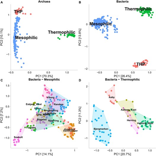 Figure 1. Principal component analysis of the microbial communities in ADs, highlighting samples by process type (mesophilic, thermophilic, mesophilic with thermal hydrolysis pretreatment (THP)). (A) The separation of archaeal communities colored by process type, (B) The separation of bacterial communities colored by process type, (C) The bacterial communities of mesophilic plants colored and labeled by plant location, (D) The bacterial communities of thermophilic plants colored and labeled by plant location.