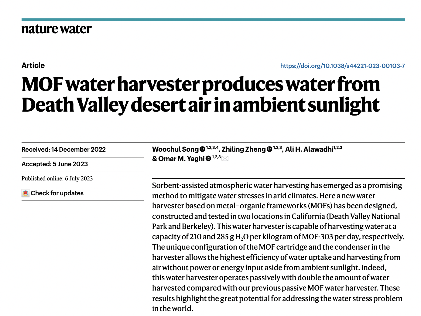 MOF water harvester produces water from Death Valley desert air in ambient sunlightSOURCE:https://www.nature.com/articles/s44221-023-00103-7.epd...