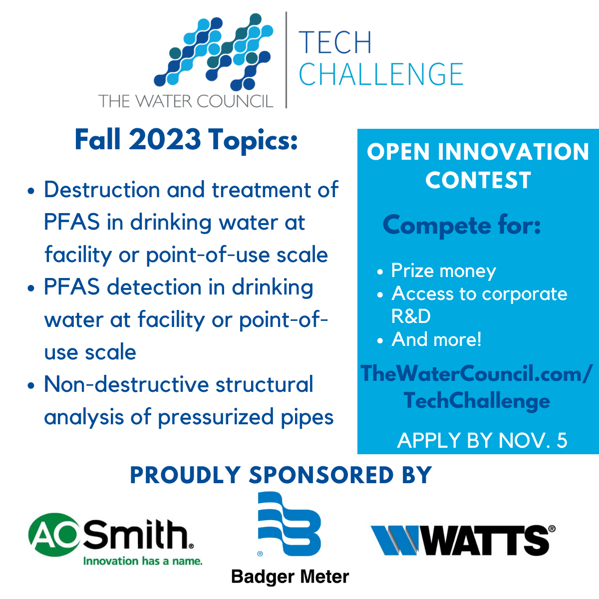 One week remaining to submit your solutions for our Tech Challenge topics! Learn more or apply by November 5th! https://thewatercouncil.com/open...