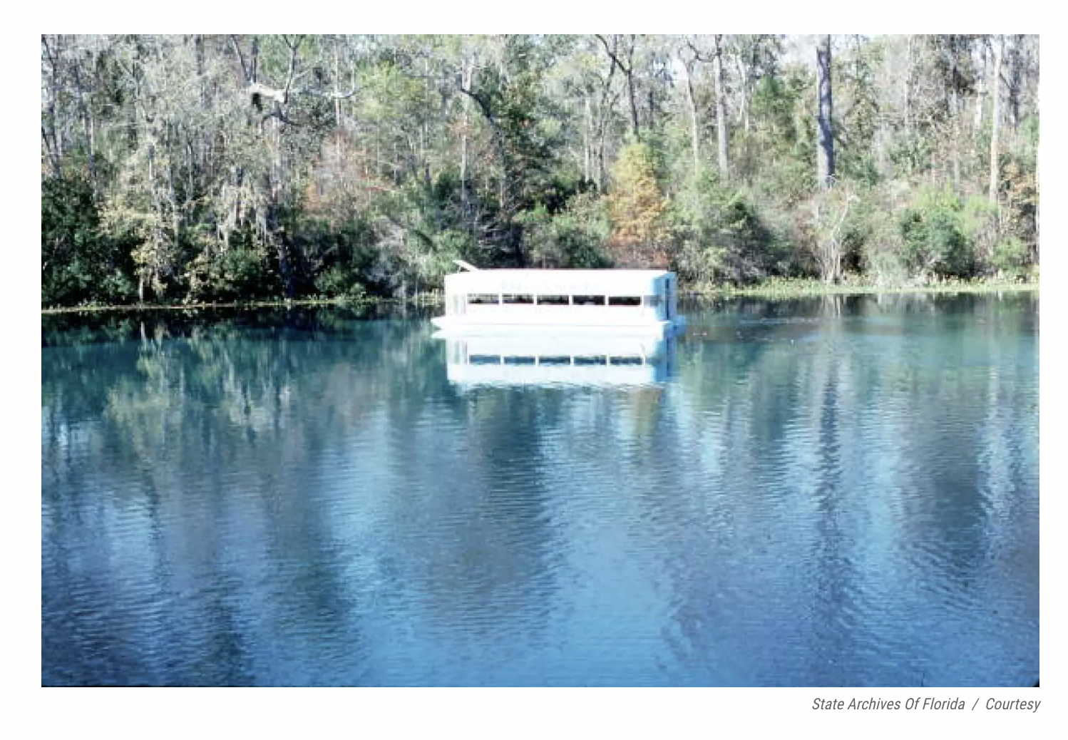 (right) A glass bottom boat on turquoise-blue Wakulla Springs in 1980, before the boats were grounded due to poor visibility.