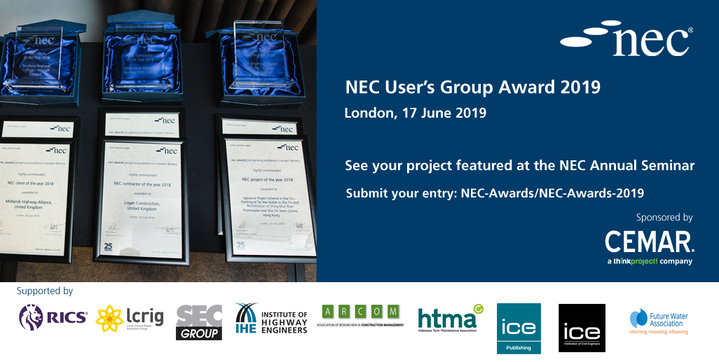 Don't miss NEC USERS' GROUP SEMINAR 2019 - 17 June 2019 (London) In alignment with Institution of Civil Engineers Year of the Water, NEC will showcase the projects involving water completed under NEC. But what is NEC? NEC is a suite of contracts called NEC that is unique in offering a complete project management solution for the entire project life-cycle.One of the spotlights of this year NEC Users’ Group Seminar will be ‘Procurement in the Water sector’.To date, NEC has been involved in a few major works both in UK and around the world. Major projects including Happy Valley Stormwater Storage Scheme, Lee Sewage Tunnel and Thames Tideways Super Sewer. Are you a contractor/supplier, a project manager, a lawyer or a commercial director working in the water sector? If you are interested to participate in the conference, happy to share with you a discount code. Read more here >>>https://www.neccontract.com/NEC3-Products/NEC-Events/NEC-Users-Group-Annual-Seminar-2019 To get a promo code, please email: giovanna.bettio@neccontract.com.
