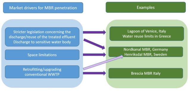 Figure 1: Market drivers for MBR technology and examples of MBR plants (Pawel Krzeminski et al.).