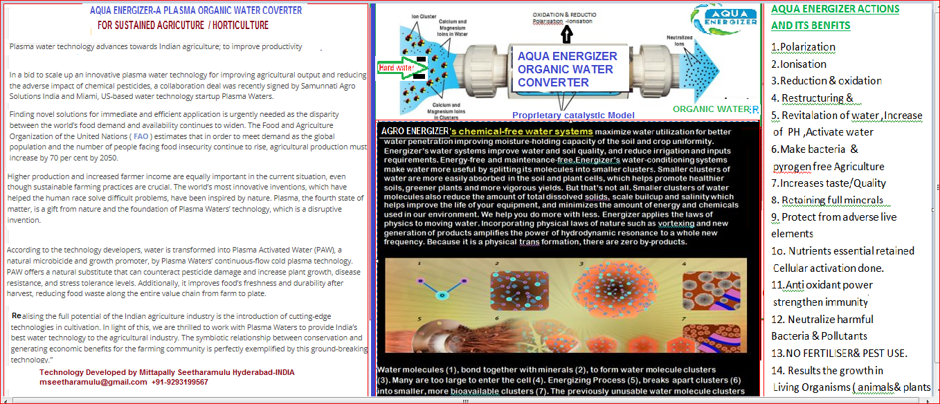 AQUA ENERGIZER FOR PLASMA ORGANIC WATER COVERTER FOR SUSTAINED AGRICULTURE / HORTICULTURE
