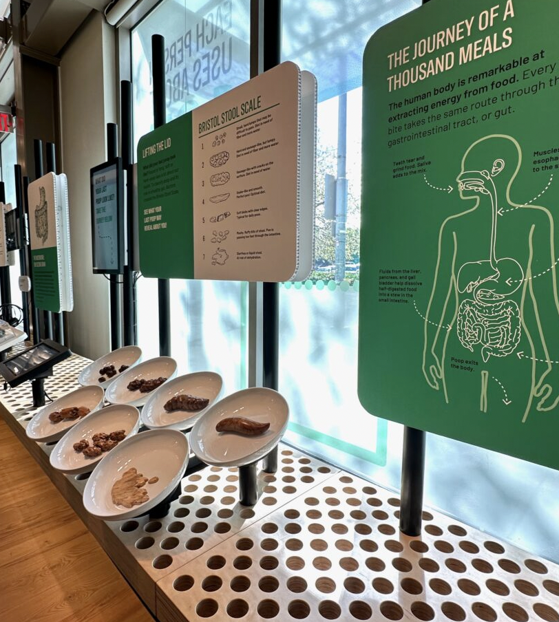 “A Better Way to Go” starts with the biology of poop — and some rather realistic wood carvings of different types of stool. (GeekWire Photo / Kurt Schlosser)