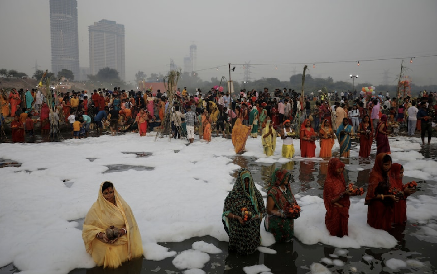 Hindus in northern India celebrated the grand Chhath Puja festival on Nov. 11 by taking a dip in the Yamuna river despite the thick foam floating on the water. (Reuters)