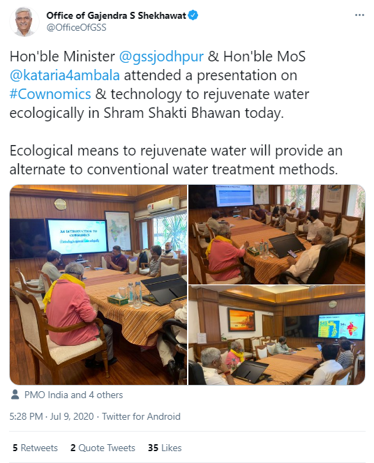It’s been very thoughtful of them to not just endorse our #Cownomics Technology in their tweet, but also Tag Prime MInister's Office @PMOIndia, @MoJSDoWRRDGR, Namami Gange @cleanganganmcg, Jal Jeevan Mission @jaljeevan_ and Jal Shakti Abhiyan @JalShaktiAbhyan