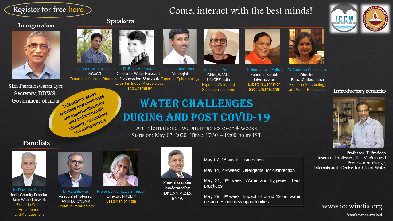 The International Centre for Clean Water (ICCW) hosts this webinar series to bring in thought- leaders, water professionals and scientists together to discuss water challenges and needs during and post COVID-19.