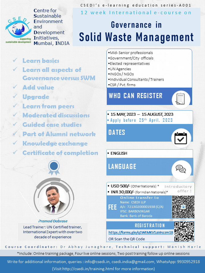Centre for Sustainable Environment and Development Initiatives (CSEDI), Navi Mumbai, India is pleased to announce a:
