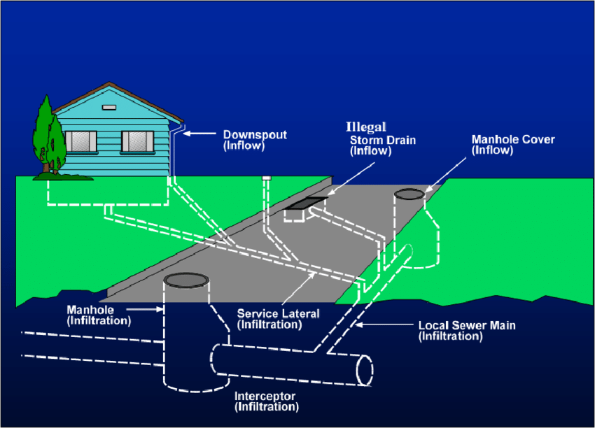 • Inflow: stormwater entering the sanitary sewer through direct connections (e.g., roof downspouts or storm drains mistakenly tied into the sanitary system).