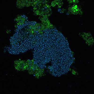 **Figure 1**: A floc of bacteria at 400X magnification removing phosphorus from medium in the lab. All bacteria were stained green, with *Candidatus Accumulibacter Phosphatis* (phosphorus-accumulating) stained blue. Courtesy of Connor Skennerton. Source: Wikimedia Commons. This figure is shown in the American Society for Microbiology.