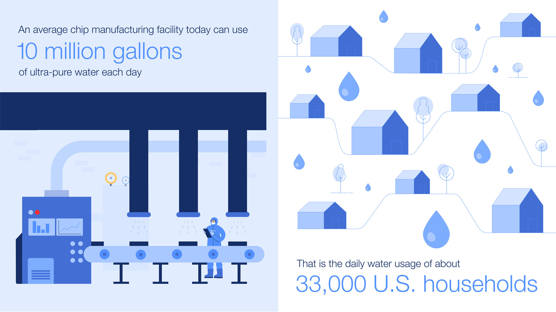 An average chip manufacturing facility today can use 10 million gallons of ultrapure water per day—as much water as is used by 33,000 US households every day.