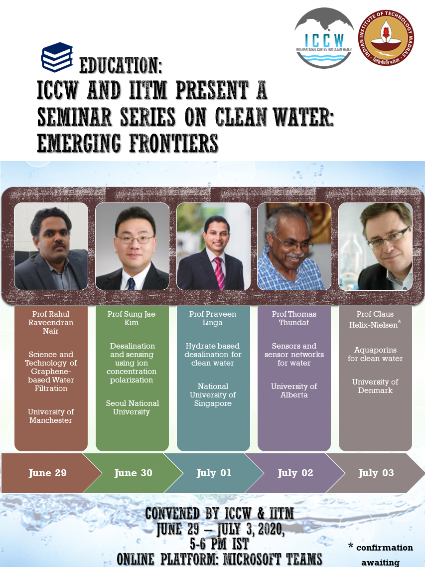 ICCW and IITM present A seminar series on Clean Water: Emerging FrontiersJune 29 - July 03, 2020, 5-6 pm IST, Online: Microsoft TeamsRegister no...