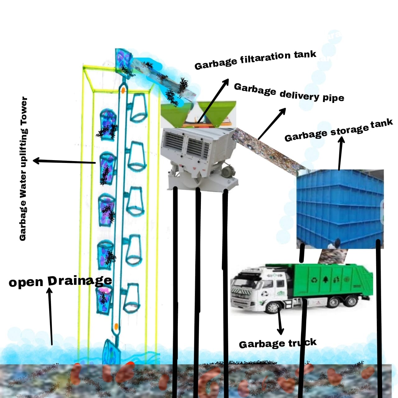Our Patented Water Vertically Uplifting Technology, Entirely Reduce This Process, Expenses.This System Total Cost Maximum 10,00,000/- Rupees Only. This Can Filter,PurifyUpto 30 Lakh Liters Of Sewage Daily.So For Every Two Kilometres One Unit Installed Then Without Human Hand Touch, Garbage And Silt Separately Loaded To The Garbage Trucks Every day. And Chlorination, Bleaching Or Any Other Chemical Treatment Can Be Done Simultaneously. Thought This ReCycled Sewage Re Used.Even In Busy Traffic Area This All Things Can Be Done Easily Without Disturbing The Public.Just One TowerUnit Is Sufficient For 20,000 Populetion.